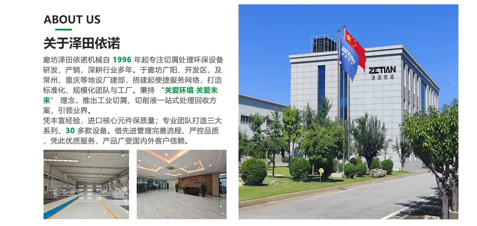 廊坊泽田依诺机械自1996年起专注切屑处理环保设备研发、产销,深耕行业多年。于廊坊广阳区、廊坊开发区,及常州、重庆、日本等地设厂建部,搭建起便捷服务网络,打造标准化、规模化团队与工厂。秉持“关爱环境关爱未来”理念,推出工业切屑、切削液一站式处理回收方案,引领业界。